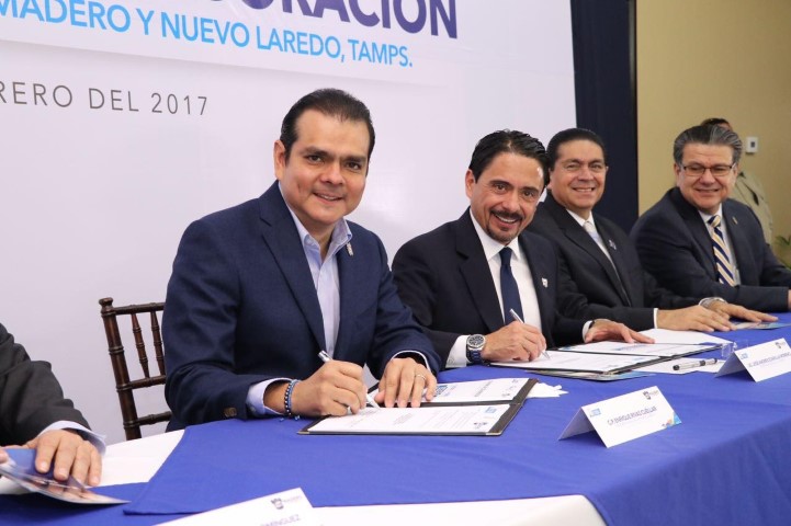 Nuevo Laredo, Tamaulipas.- Los gobiernos de Nuevo Laredo y Ciudad Madero firmaron hoy un convenio de colaboración para convertirse en ciudades más competitivas y solidarias, que busquen conjuntamente nuevas inversiones, un comercio próspero y turismo fortalecido.