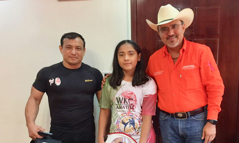 Aldama, Tamaulipas.-Jorge Luis González Rosales, alcalde de este municipio, otorgó todo el apoyo a Isis Yosselin Gómez Castillo, campeona nacional de kick boxing, y quien participará la próxima semana en el torneo mundial a celebrarse en Italia.