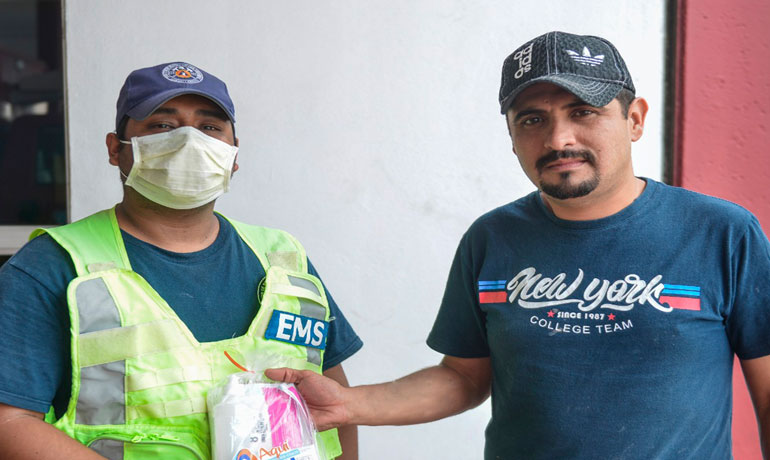 Personal de Estación Central de Bomberos y Protección Civil y sus 4 subestaciones, son los encargados de entregar gratuitamente los kits a las familias por instrucciones del presidente municipal Enrique Rivas.