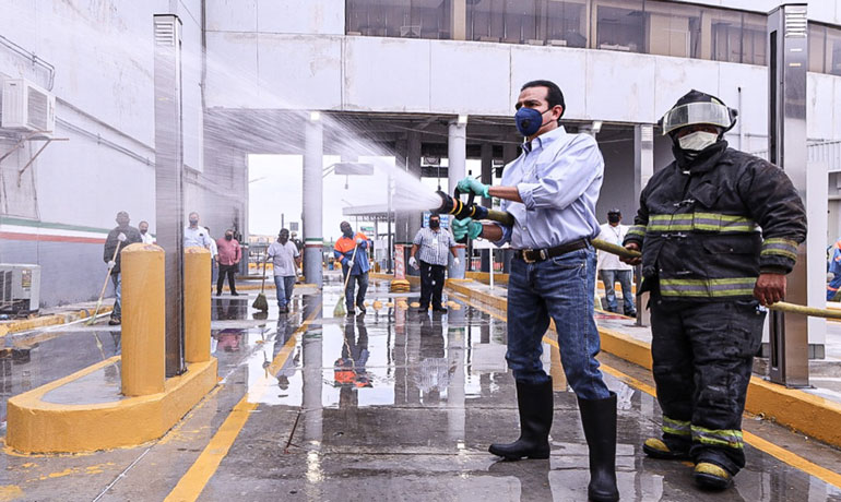 El presidente municipal Enrique Rivas continuó el programa de Desinfección Municipal de los espacios públicos y entradas de esta frontera, acudió a las instalaciones del Puente Internacional No. 1 De las Américas para limpiar y sanitizar el área.