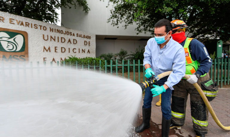 Como parte de las acciones del gobierno municipal para cuidar la salud del personal médico que labora en la Unidad de Medicina Familiar (UMF) 78 del Instituto Mexicano del Seguro Social (IMSS), el alcalde Enrique Rivas entregó insumos y encabezó la sanitización y limpieza del lugar en prevención del coronavirus.