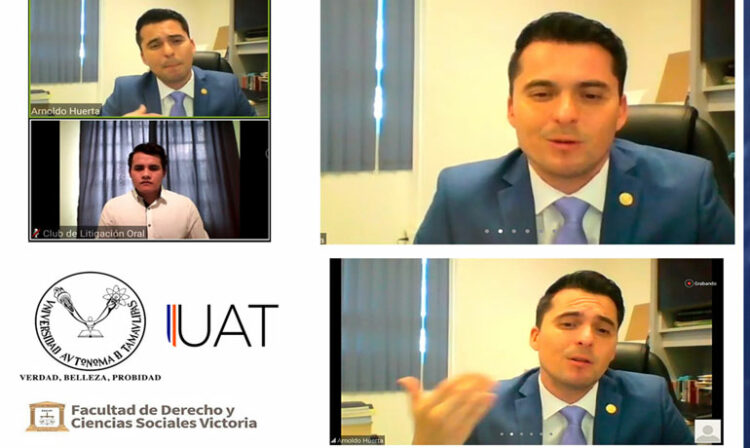 Nuevo Laredo, Tamaulipas.- En el marco de la Tercera Jornada de Conferencias a Distancia organizada por el Club de Litigación Oral de la Facultad de Derecho y Ciencias Sociales Victoria (FDCSV) de la Universidad Autónoma de Tamaulipas (UAT), se impartió el tema: “Nuevos retos en la impartición de Justicia”, por el Mtro. Arnoldo Huerta Rincón, Secretario Ejecutivo del Consejo de la Judicatura del Poder Judicial del Estado de Tamaulipas.