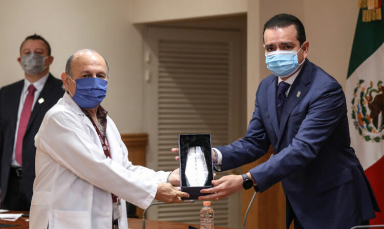 Rivas Cuéllar entregó el reconocimiento a los doctores: Rafael García Ramírez, administrador de la Cruz Roja Mexicana; Pablo Mendoza Becerril, director del Hospital COVID; Mario Pineda Maldonado, jefe de enseñanza del Instituto Mexicano del Seguro Social (IMSS).