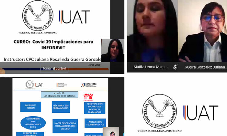 La Universidad Autónoma de Tamaulipas (UAT) llevó a cabo el curso en línea “Covid-19, implicaciones para Infonavit”, dirigido a las pequeñas y medianas empresas, con la finalidad de brindar actualización sobre este importante tema, mismo que fue impartido dentro del Programa de Apoyo a la Gerencia para su Desarrollo y Activación que se ofrece de manera gratuita por la plataforma de Microsoft Teams.