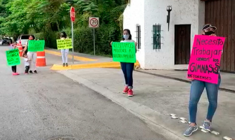 Ciudad Victoria, Tamaulipas.- Un grupo de personas protestaron hoy frente a la Casa del gobernador de Tamaulipas, Francisco García Cabeza de Vaca, para exigir la reapertura de los gimnasios en la capital del estado.