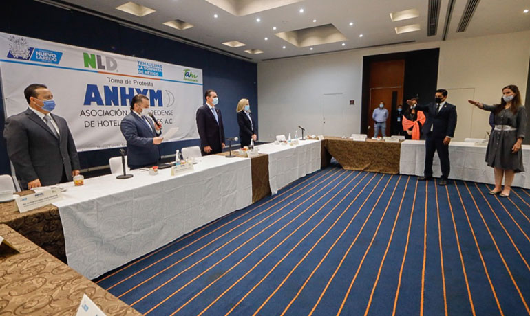 Nuevo Laredo, Tamaulipas.- El secretario de Turismo de Tamaulipas, Fernando Olivera Rocha, junto con el presidente municipal, Enrique Rivas Cuéllar, tomó protesta a los miembros de la mesa directiva de la nueva Asociación Neolaredense de Hoteles y Moteles, A.C.