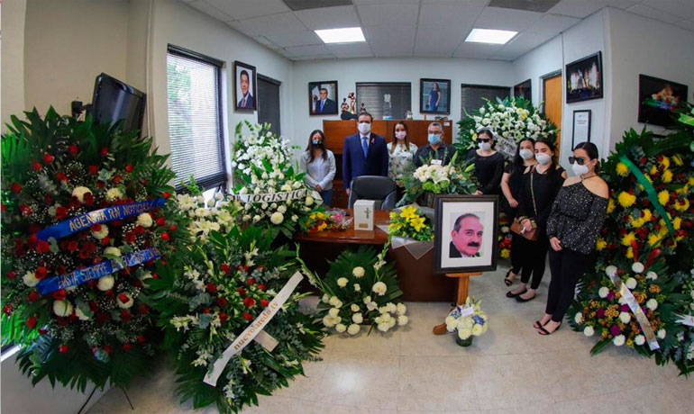 La Primera Síndica Dorina Lozano Coronado y el Primer Síndico Santiago Sáenz Cárdenas acompañaron al presidente municipal ante la urna con las cenizas del funcionario colocada sobre su escritorio y sus hijas Karla Citlalli, Natalia Giselle, Melina Elizabeth y Alexia Paola García Fernández.
