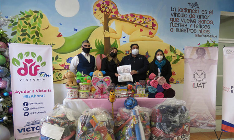 Nuevo Laredo, Tamaulipas.- La Universidad Autónoma de Tamaulipas (UAT) entregó al Sistema DIF Municipal Victoria, el donativo de 900 juguetes para niños y niñas, como parte de la colaboración voluntaria y altruista de la comunidad universitaria.