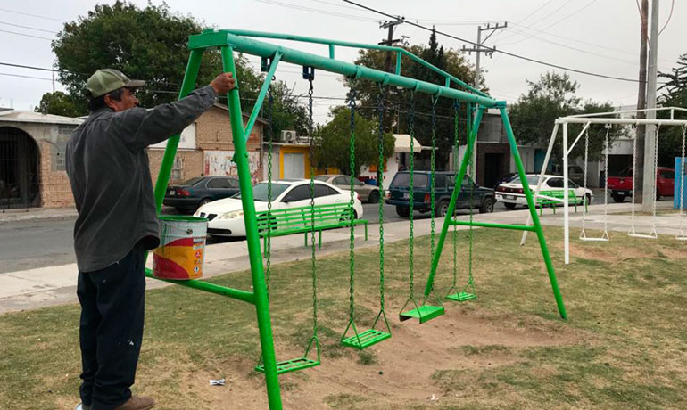 Nuevo Laredo, Tamaulipas.- La Secretaría de Servicios Públicos Primarios da mantenimiento con pintura al equipamiento urbano de diversos espacios recreativos de la ciudad, como son bancas, juegos infantiles, asadores, kioscos.