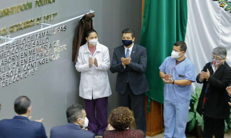 Ciudad Victoria, Tamaulipas.- Como un justo reconocimiento por su entrega y labor frente al Covid-19, el Gobernador, Francisco García Cabeza de Vaca, inscribió en los muros del Congreso del Estado, una dedicatoria para todos los médicos, enfermeras y personal de hospital que han fallecido debido a la pandemia.