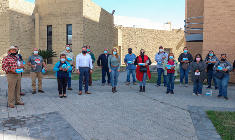 Nuevo Laredo, Tamaulipas.- El gobierno municipal entregó cubrebocas y gel antibacterial a representantes de las “pulgas” y otras agrupaciones del comercio informal, en apoyo a las medidas de salubridad contra el Coronavirus.