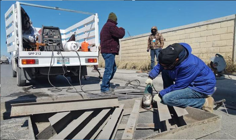 Nuevo Laredo, Tamaulipas.- Personal de Servicios Públicos Primarios repara las rejillas tipo guardaganado en la avenida Emiliano Zapata, colonia la Concordia, dañadas por el incremento del tránsito vehicular y de carga pesada.