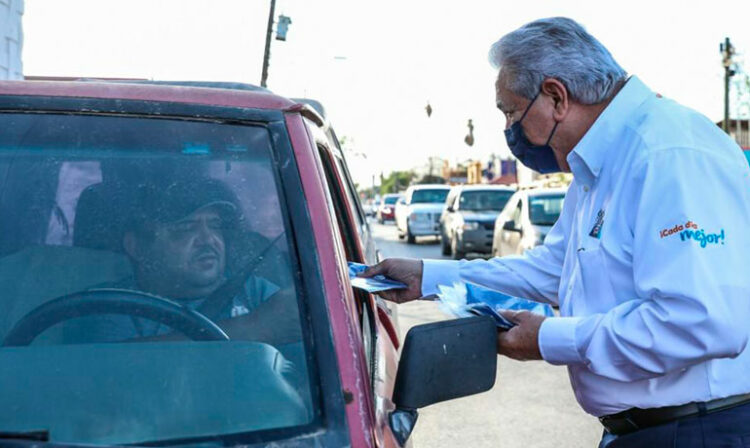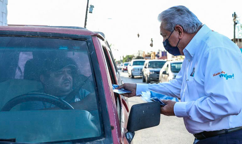 En el crucero de Eva Sámano y Revolución, acompañado de estudiantes de la Universidad Tecnológica (UT), Sanmiguel Cantú exhortó a los automovilistas a utilizar la mascarilla para evitar riesgo de contagio por Covid.