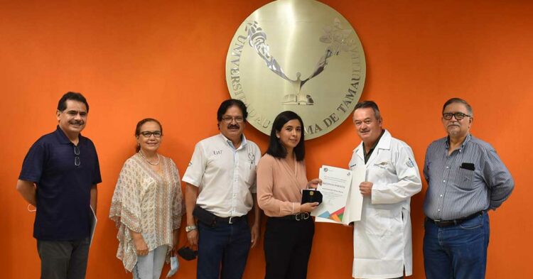 Con la representación del Rector de la UAT, Ing. José Andrés Suárez Fernández, el Director del plantel universitario, Dr. Pedro Luis Mendoza Múzquiz, entregó personalmente el reconocimiento a la alumna Karla Esmeralda Ramos Reyna.