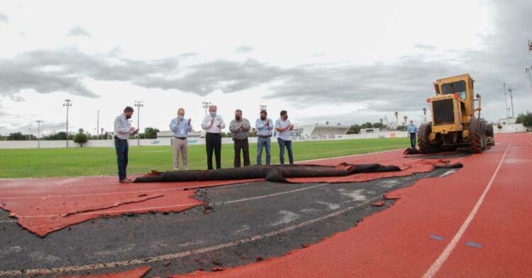 La mañana de este jueves, el alcalde junto al regidor Juan José Zárate y el director de Deportes, Saíd Galindo, dio la señal de arranque a la maquinaria encargada de retirar la carpeta de tartán deteriorada.