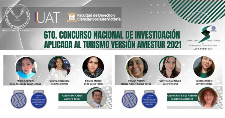 Estudiantes y docentes de la Facultad de Derecho y Ciencias Sociales Victoria (FDCSV) de la Universidad Autónoma de Tamaulipas (UAT) obtuvieron el segundo y tercer lugar en el Sexto Concurso Nacional de Investigación Aplicada al Turismo versión AMESTUR 2021.