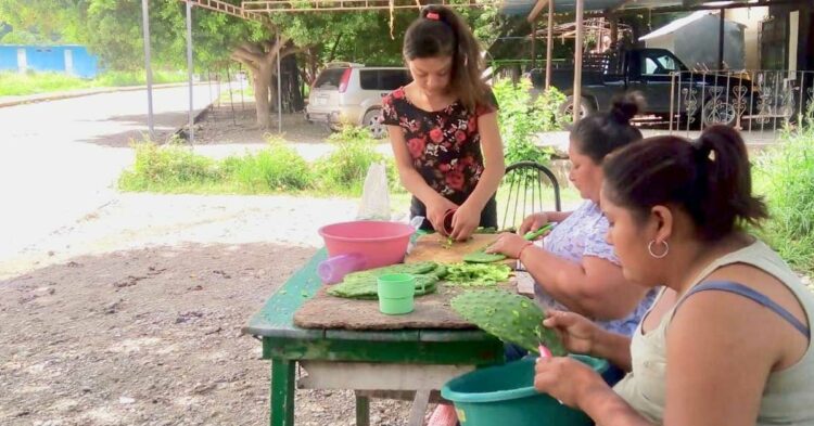 Ciudad Victoria, Tamaulipas.- Un grupo de mujeres victorenses decidieron emprender un negocio de venta de nopales recién cortados de la huerta, colocando su puesto en la calle.