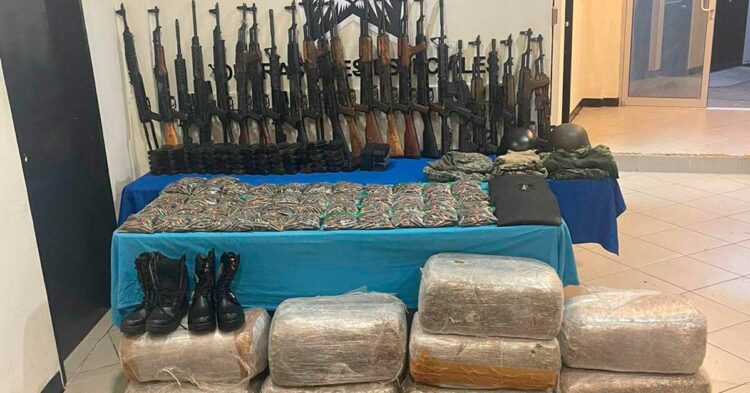 Durante esta acción también fueron asegurados paquetes embalados que contenían 90 kilogramos de hierba seca con las características de mariguana y 16 chalecos antibalas.
