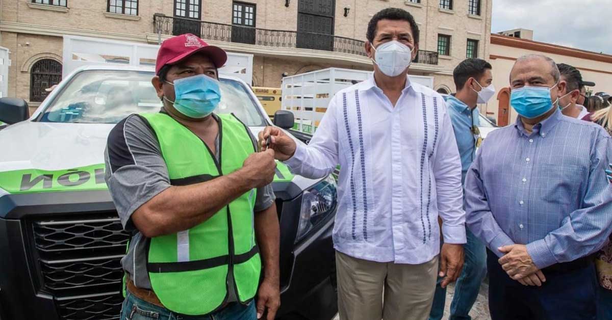La entrega del nuevo equipamiento a las Secretarías de Salud Pública Municipal y de Desarrollo y Bienestar Social tuvo lugar en la plaza principal, marco en el que López Hernández informó que este mismo martes por la tarde iniciarán las acciones de fumigación en los diferentes sectores de la ciudad.