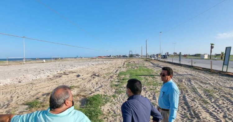 Matamoros, Tamaulipas.- Durante una visita realizada a la Playa Bagdad, el Presidente Municipal supervisó los trabajos de construcción de una plataforma en donde será instalado el tobogán adquirido por el Gobierno de Matamoros y cuya instalación se había postergado a causa de la pandemia por COVID-19.