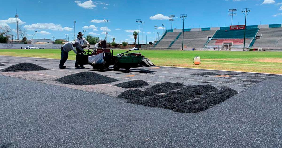 Indicó que la reparación es en una superficie de 5 mil 716 metros cuadrados de tartán, además del suministro e instalación de luminarias tecnoled tower light RHBT-600 W y retiro de butacas.