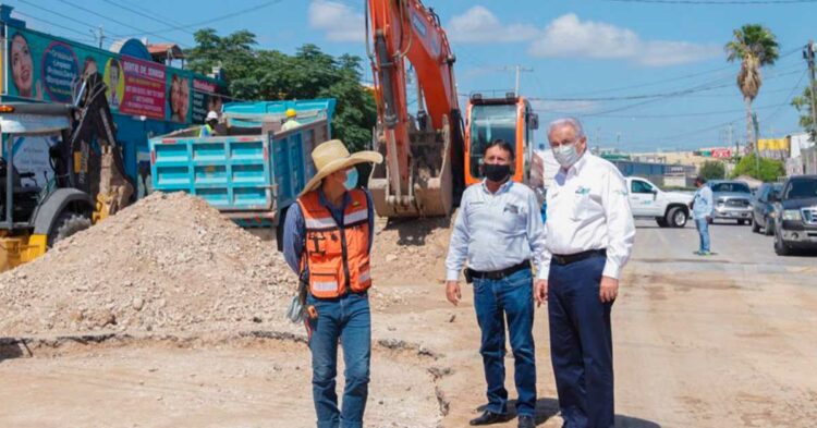 El otro punto al que acudió el Alcalde, fue la calle Pedro Morales, entre avenida Fundadores y avenida Tecnológico, en la colonia Infonavit, donde se realiza la rehabilitación del subcolector sanitario y socavón que ahí se generó.