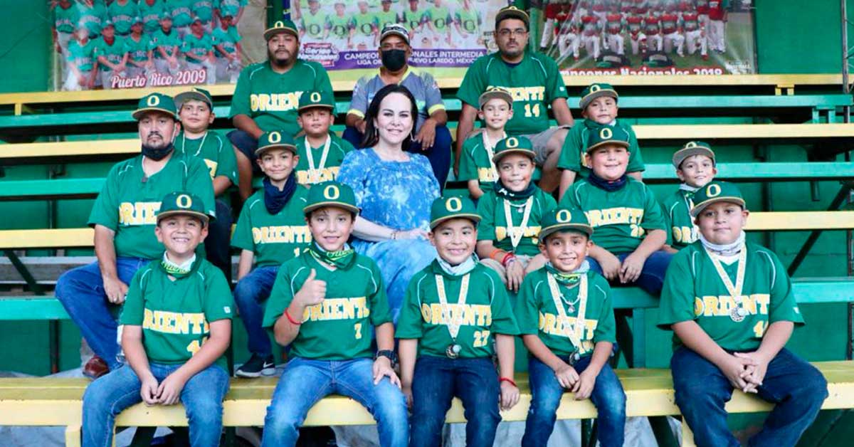 Nuevo Laredo, Tamaulipas.- Carmen Lilia Canturosas Villarreal felicitó a los campeones nacionales de la Liga Oriente de béisbol en la categoría «Moyote», a quienes prometió una beca escolar siempre y cuando continúen con buenas calificaciones; además ratificó su compromiso de impulsar el deporte para que Nuevo Laredo vuelva a ser una potencia en ese rubro.