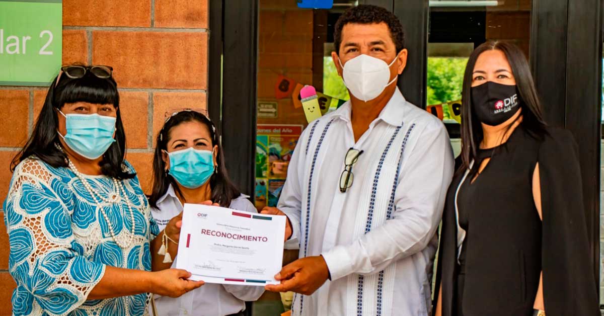 Al hacer entrega del nuevo edificio construido por el Gobierno de México a través de la Secretaría de Desarrollo Agrario, Territorial y Urbano -SEDATU- el Presidente Municipal de Matamos hizo un reconocimiento a la Profra. Margarita García Spark, quien cuenta con una trayectoria de más de 45 años sirviendo a la educación.