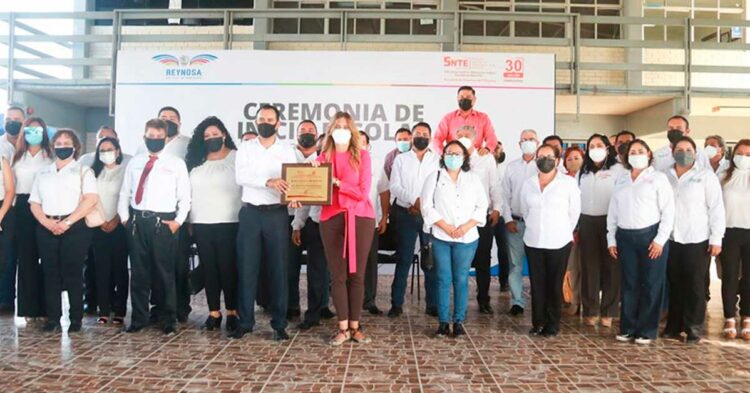 El Profesor Acuña Tovías entregó, a nombre del magisterio reynosense, un reconocimiento a la Presidente Municipal, por su apoyo a la educación con las Becas Escolares; «Hoy presenciamos un hecho histórico, donde estamos todos juntos, alumnos, maestros, padres de familia y autoridades, uniendo esfuerzos y cuidando siempre la salud, vamos a atender el derecho a la educación en los tiempos de COVID», dijo estando presente la joven Briani Maybeth Fernández Sánchez, alumna del CETIS 71.