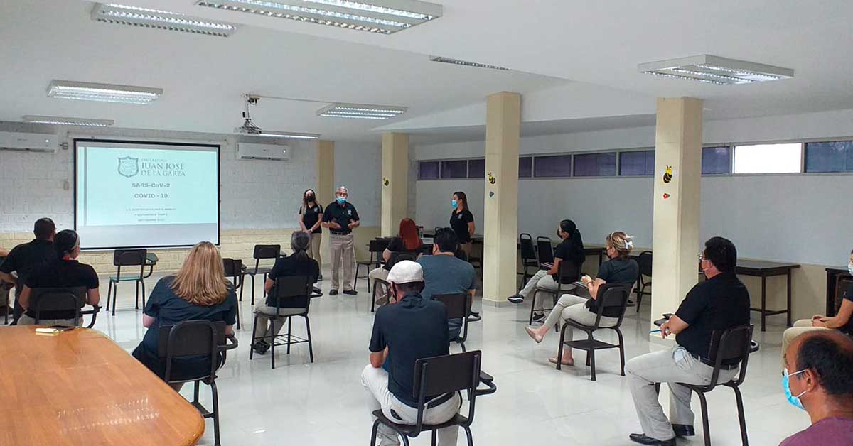 Cumpliendo con las indicaciones que marca la Secretaría de Salud en Tamaulipas, particularmente de Comisión Estatal para la Protección contra Riesgos Sanitarios ( Coepris), personal docente, administrativo y de apoyo de la Preparatoria Juan José de la Garza, continúa recibiendo pláticas sobre cómo prevenir el Coronavirus en medio de ésta contingencia.