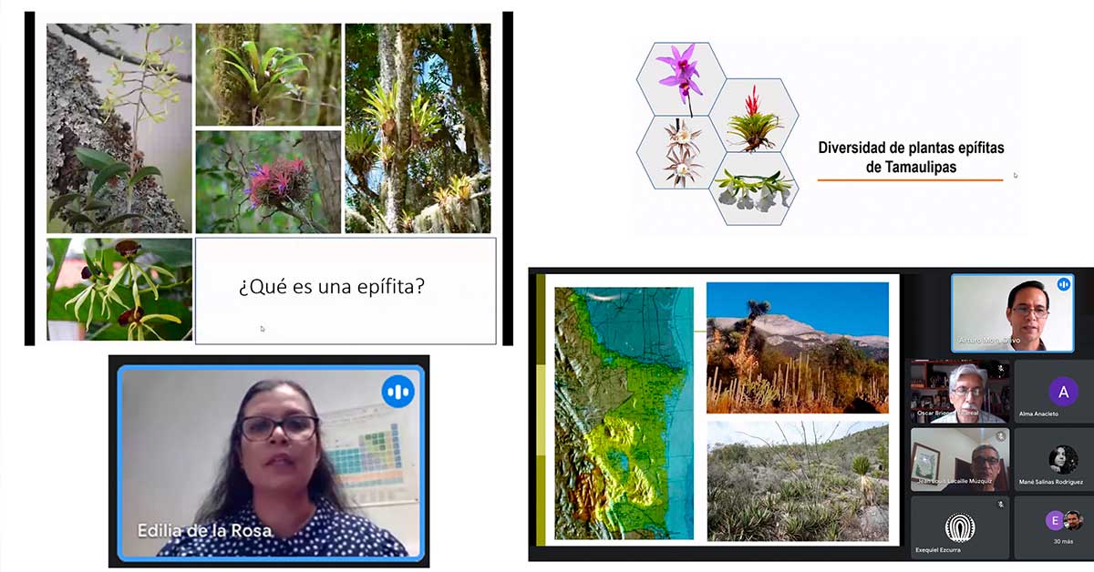 En este contexto, la investigadora Edilia de la Rosa Manzano dictó la conferencia “Diversidad de plantas epífitas de Tamaulipas”, en la que describió algunos de los proyectos que, durante años, ha trabajado la Universidad para salvaguardar estas especies en zonas como la reserva de la biosfera El Cielo.