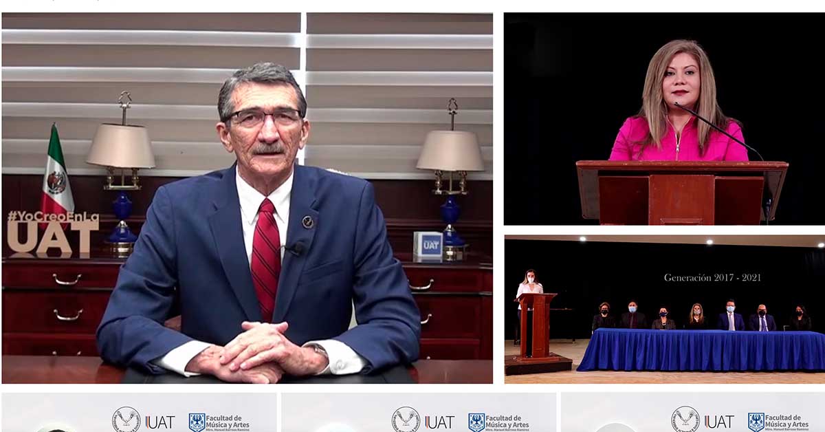 El máximo directivo de la UAT reconoció el esfuerzo que maestros y estudiantes hicieron por adaptarse a un proceso educativo diferente debido a la pandemia de COVID-19, y felicitó a la nueva generación de egresados de Licenciatura en Música, Licenciatura en Educación Artística y Técnico Superior Universitario en Música.