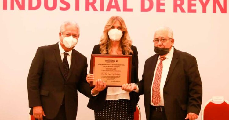 Reynosa, Tamaulipas.- El líder de la Cámara Nacional de la Industria de la Transformación, CANACINTRA, de esta ciudad, C. P. Federico Alanis Peña, entregó un valioso reconocimiento a la Presidente Municipal, en el marco de una gran celebración que reunió a los representantes del sector maquilador, Cámaras, empresas locales y liderazgo sindical.