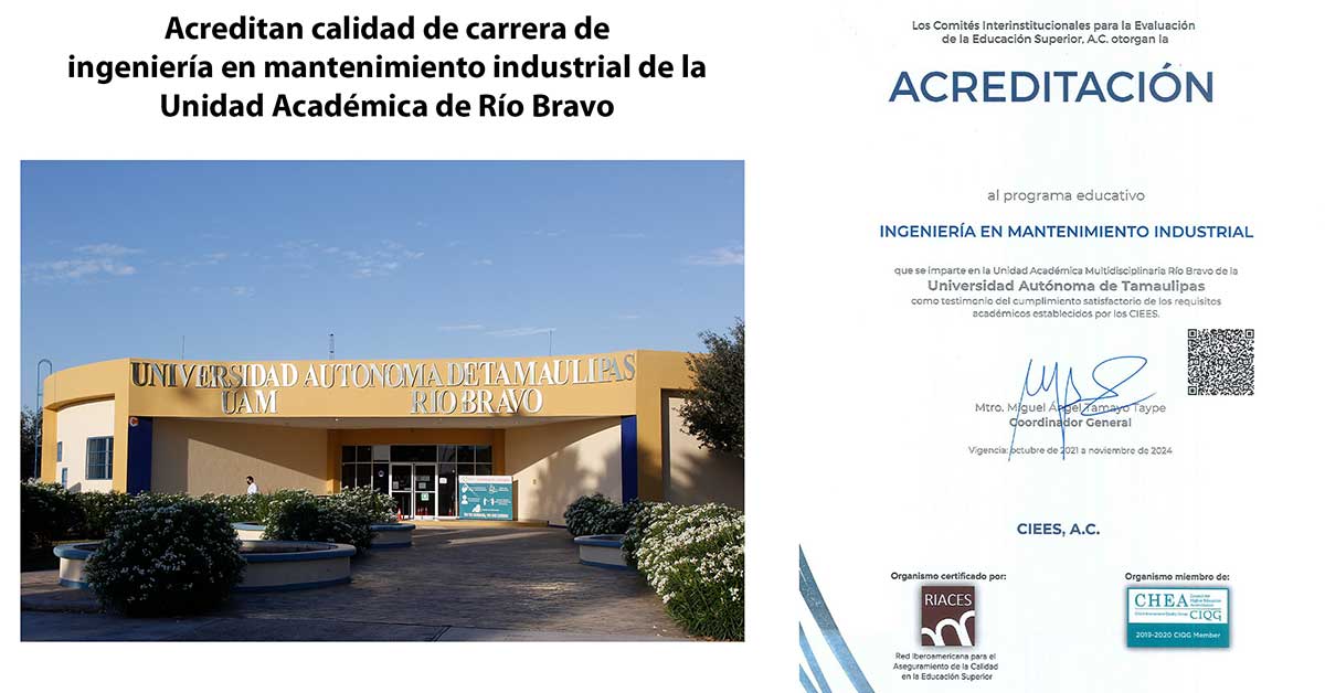 El programa educativo de Ingeniería en Mantenimiento Industrial que imparte la Universidad Autónoma de Tamaulipas (UAT) en la Unidad Académica Multidisciplinaria Río Bravo (UAMRB) recibió la acreditación nacional de los Comités Interinstitucionales de Evaluación de la Educación Superior (CIEES).