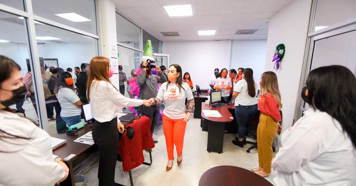 La alcaldesa Carmen Lilia Canturosas Villarreal, Cynthia Canturosas Villarreal, presidenta del Consejo Consultivo del Instituto Municipal de la Mujer (INMUJER) y Cynthia Rodríguez Leija, directora del Instituto INMUJER, realizaron un recorrido por Presidencia Municipal para colocar un distintivo de color naranja al personal de la administración municipal.