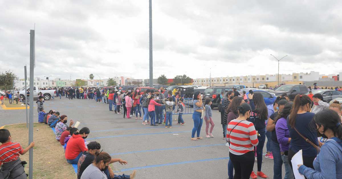 Los niños, junto con sus padres o tutores, acudieron al Centro Cultural para ser trasladados, en 10 camiones, al Puente Internacional Juárez-Lincoln, para poder recibir la vacuna contra el COVID-19.
