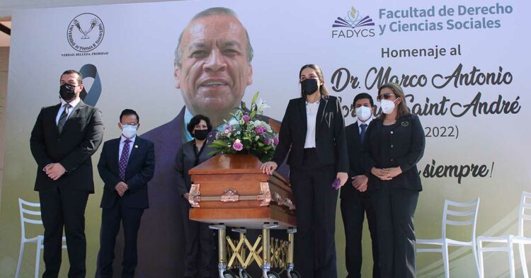 El homenaje de cuerpo presente se llevó a cabo este lunes 31 de enero en la explanada de la FADYCS con la asistencia de la familia del Dr. Cortina Saint André, directores y directoras de las facultades del Centro Universitario Sur, docentes, personal directivo, administrativo y estudiantes del plantel.