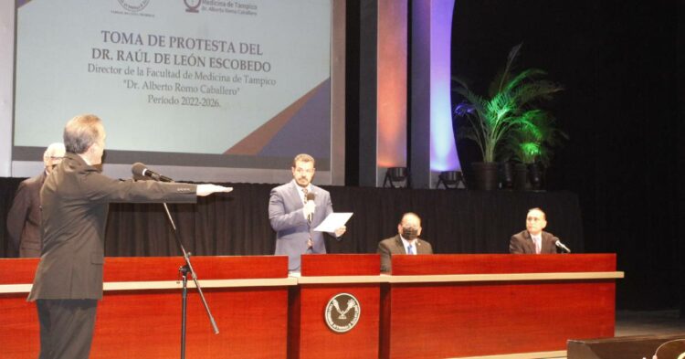 El C. P. Guillermo Mendoza Cavazos, Rector de la Universidad Autónoma de Tamaulipas (UAT), presidió la toma de Protesta del Dr. Raúl de León Escobedo, como Director de la Facultad de Medicina de Tampico “Dr. Alberto Romo Caballero” para el período 2022-2026.