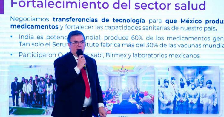El canciller señaló que India “puede apoyarnos para garantizar abasto de medicamentos, mejores precios y que tengamos producción de vacunas en México”, al ser el país productor del “60 por ciento de los medicamentos genéricos globales” y tener “los mejores precios de todo el mundo”. Subrayó que el objetivo es que “México recupere su capacidad de producción de vacunas”, como lo instruyó el presidente de la República.