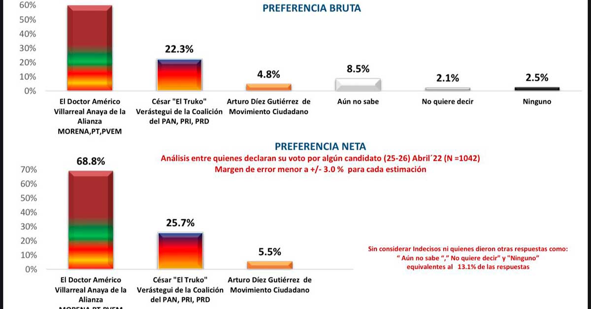 Esta medición metodológica refleja también que el candidato morenista, doctor Américo Villarreal tiene una preferencia bruta del 59. 8 por ciento, contra un 22.3 por ciento y un 4.8 por ciento de sus adversarios, Cesar Verastegui y Arturo Diez, respectivamente.