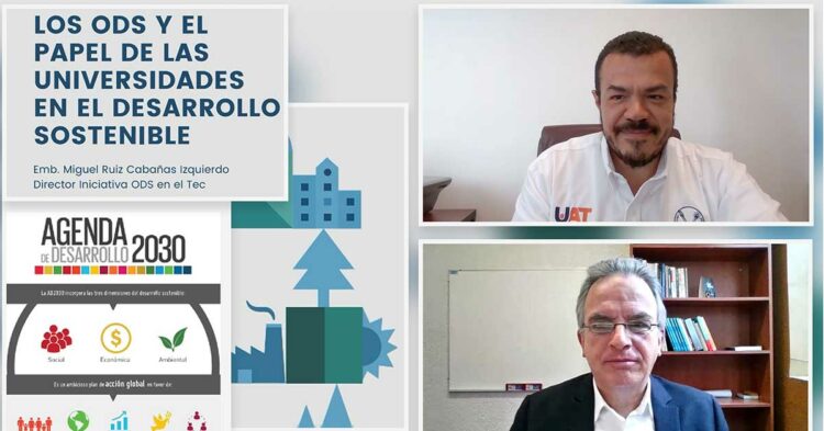 Posteriormente, el Embajador Miguel Ruiz Cabañas Izquierdo, director de la iniciativa sobre los Objetivos de Desarrollo Sostenible en el Instituto Tecnológico y de Estudios Superiores de Monterrey, dictó la conferencia virtual “Los ODS y el papel de las universidades en el desarrollo sostenible”, en donde destacó que ese concepto nació a nivel internacional a raíz del abuso que se estaba haciendo de los recursos naturales, y que, a partir de esa declaración, se estableció el compromiso de los países de cuidar el medioambiente.