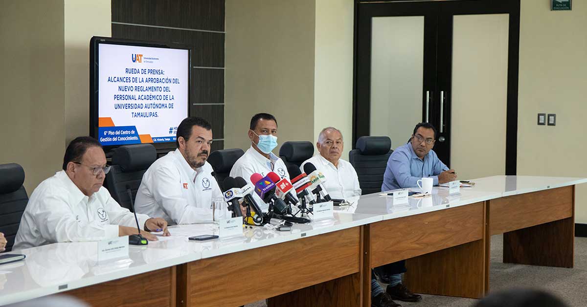 En rueda de prensa desarrollada en el Edificio de Gestión del Conocimiento del campus Victoria, el Rector presentó los lineamientos del nuevo reglamento del personal académico que establece las bases para generar una convocatoria que permita realizar una amplia basificación de profesores que están por contrato, y que, conforme a estos lineamientos puedan tener mayor certeza laboral y seguridad social.