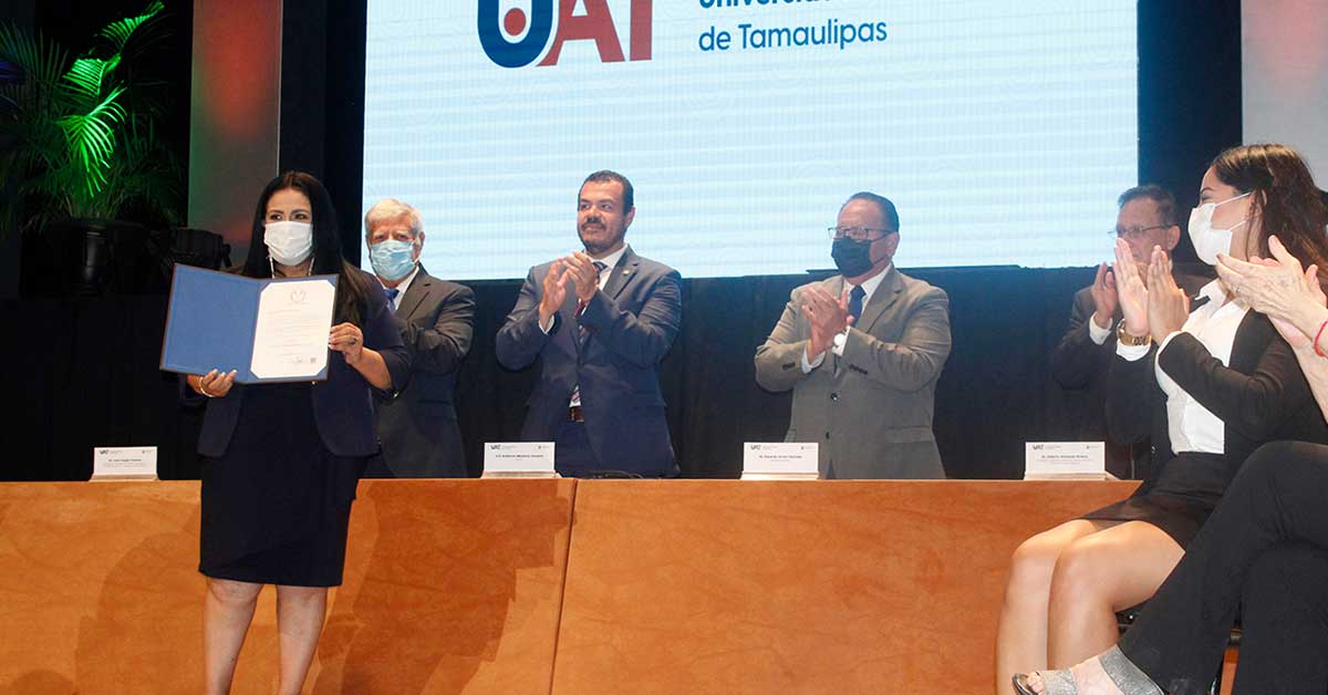 El C. P. Guillermo Mendoza Cavazos, Rector de la Universidad Autónoma de Tamaulipas (UAT), encabezó la ceremonia de toma de protesta de la Mtra. Elda Ruth de los Reyes Villarreal como Directora de la Facultad de Derecho y Ciencias Sociales Tampico (FADYCS) para el periodo 2022-2026.