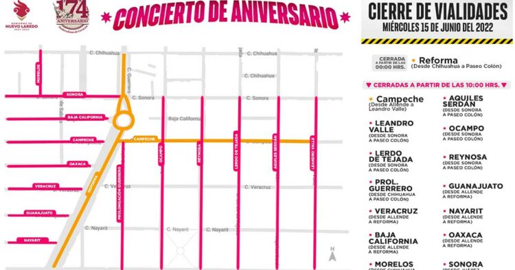 Nuevo Laredo, Tamaulipas.- Para llevar a cabo el festejo del 174 aniversario de Nuevo Laredo en la rotonda al Monumento a Benito Juárez con el gran concierto de los grupos Duelo y La Trakalosa de Monterrey, se cerrarán algunas vialidades para un mejor esparcimiento y seguridad de los asistentes.