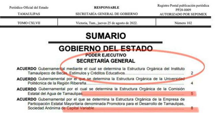 Lo más sorprendente en el número 102 del POE es el Acuerdo Gubernamental por el que se determina la Estructura Orgánica de la Empresa de Participación Estatal Mayoritaria denominada Promotora para el Desarrollo de Tamaulipas, Sociedad Anónima de Capital Variable, un organismo que prácticamente ha operado en la opacidad y cuyas actividades y manejo de recursos públicos son administrados con total hermetismo en la Secretaría de Desarrollo Económico del Estado a cargo de Carlos García González.