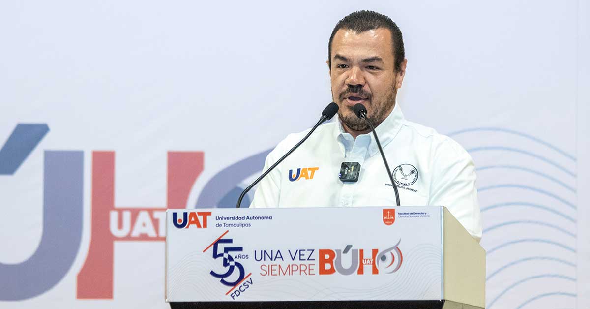 El C. P. Guillermo Mendoza Cavazos, Rector de la Universidad Autónoma de Tamaulipas (UAT), presidió la ceremonia inaugural de la Feria Estatal de Proyectos e Iniciativas Ciudadanas «Juventudes Transformadoras», organizada por la Facultad de Derecho y Ciencias Sociales Victoria (FDSCV) en el marco de su 55 aniversario.