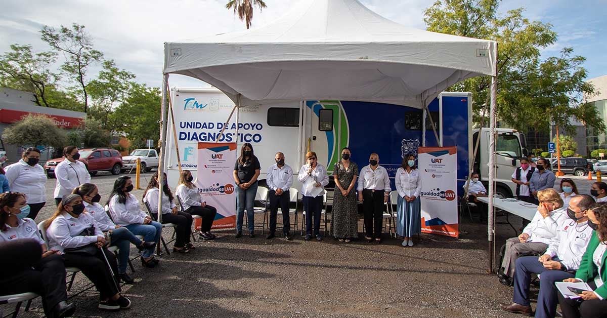 En el camellón central de acceso al campus se instaló la Unidad Móvil de Apoyo Diagnóstico, la cual brindará más de cincuenta servicios diarios de tamizaje por mastografía, a fin de prevenir y diagnosticar oportunamente el cáncer de mama, además de pruebas de Papanicolaou, a disposición de las mujeres de la UAT, así como a las familiares de algún integrante de esta comunidad universitaria.