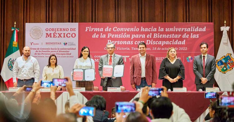 El gobernador explicó que a la fecha en Tamaulipas, este programa de Pensión para el Bienestar de las Personas con Discapacidad beneficia ya a 24 mil personas, lo que representa una derrama de cerca de 400 millones de pesos; con la firma de este convenio serán dadas de alta 28 mil tamaulipecas y tamaulipecos que presentan algún tipo de discapacidad permanente, mayores de 29 años y menores de 64 años, para lo cual el gobierno del estado aportará el 50 por ciento del presupuesto requerido.