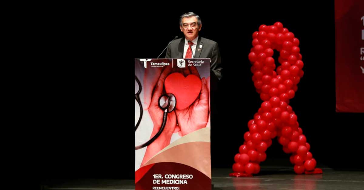 Al inaugurar el primer Congreso de Medicina: Reencuentro «Medicina y Humanidad» y en el marco del mes de la sensibilización del cáncer de mama y de la celebración del Día del Médico, el gobernador de Tamaulipas llamó a no bajar la guardia y a seguir atentos a los males que los pueden afectar y recordó que, “la salud no es solo la ausencia de enfermedad, sino el bienestar físico, mental, psicológico y social de una sociedad”.