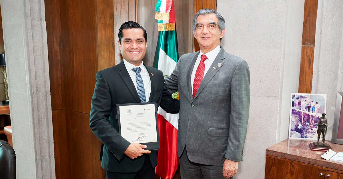 Ciudad Victoria, Tamaulipas.- El gobernador Américo Villarreal Anaya, designó a José Fernando Centeno Sierra como representante del Gobierno de Tamaulipas en la Ciudad de México, adscrito a la Oficina del Ejecutivo; Centeno Sierra recibió de manos del Gobernador el nombramiento en las oficinas de Palacio de Gobierno.